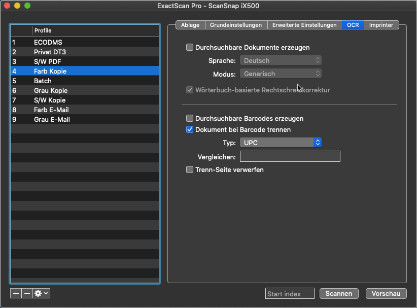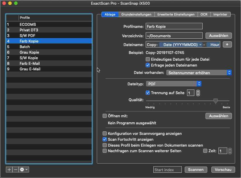 Die Einstellungen sind übersichtlich und selbsterklärend. Manche muss Du einfach Testen, um das Beste Ergebnis zu erhalten; richte ExactScan(Werbelink) einfach so ein, wie Du es benötigst - die Möglichkeiten sind vorhanden.