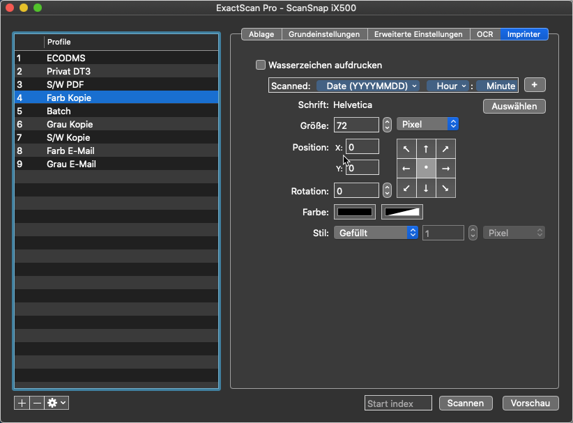 Automatisches Wasserzeichen auf allen Seiten Deines Scans mit verschiedenen automatischen Optionen, wie Datum, Stunde, Minute etc und Deinen Texten.