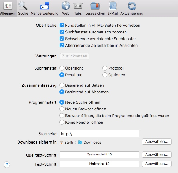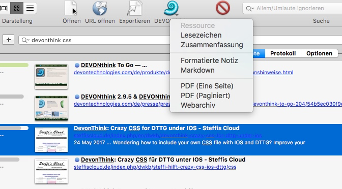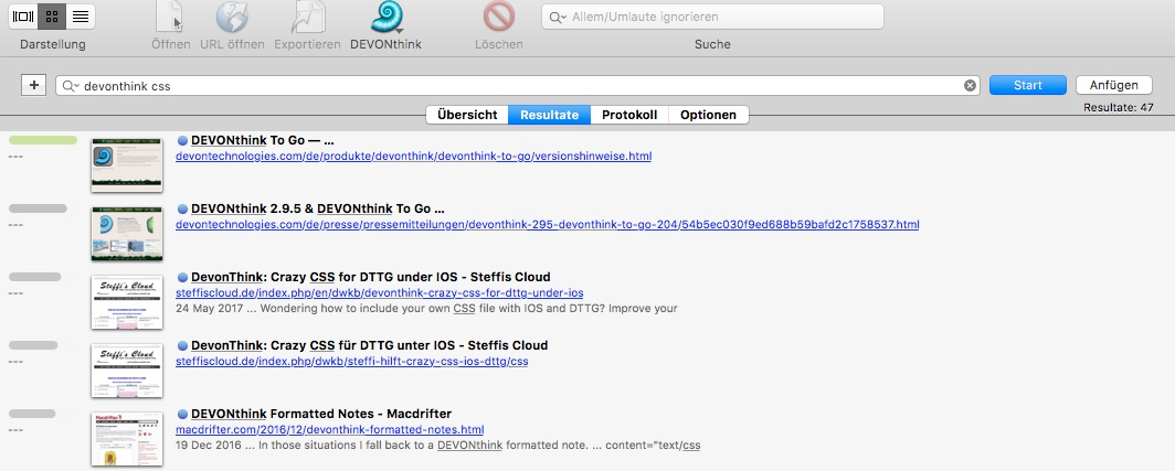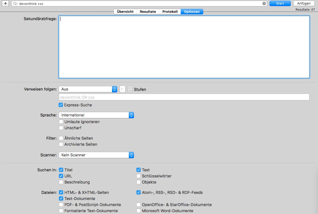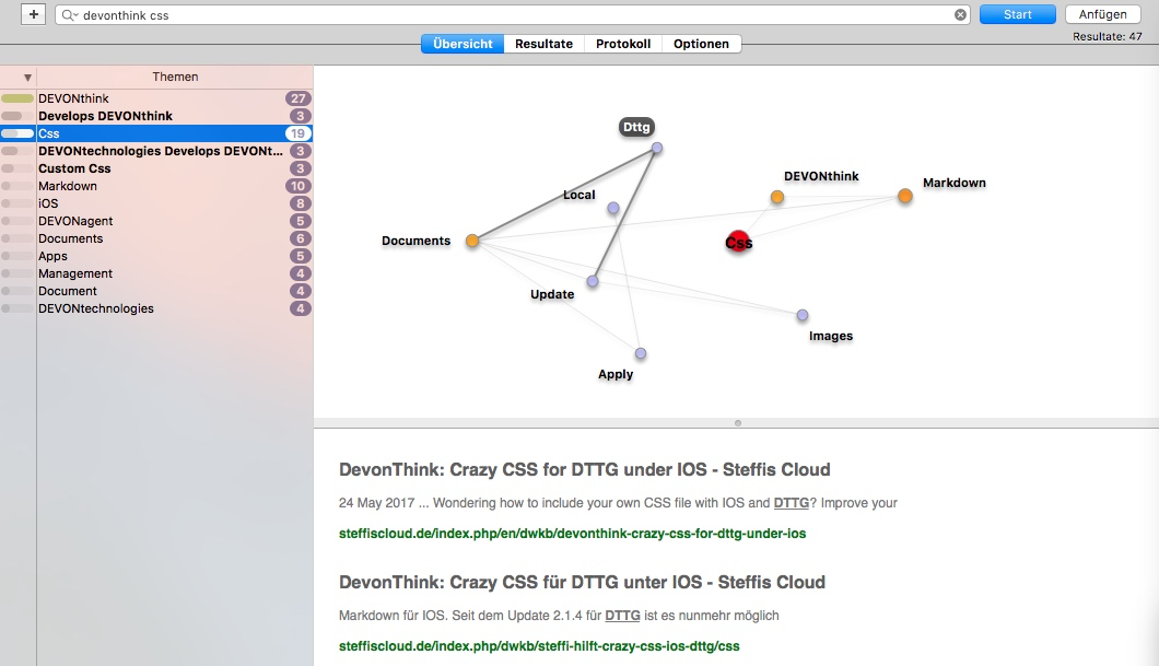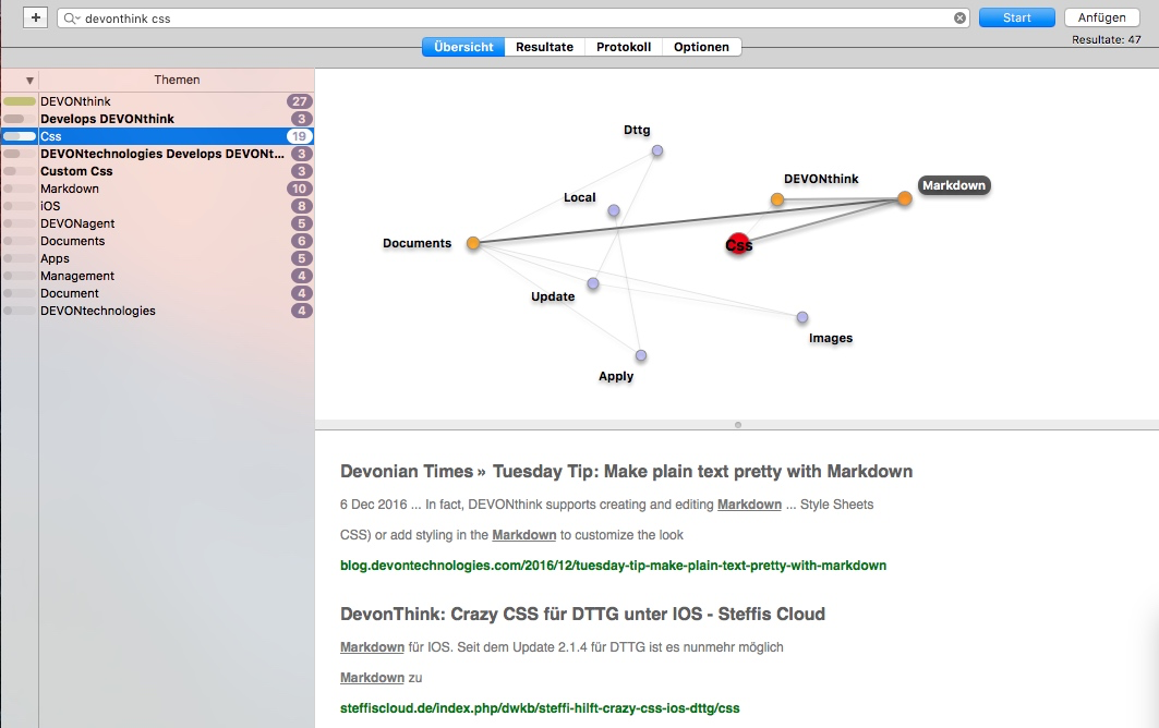 As an example: You like to know more about DevonThink and CSS. This two words you can enter in the search field and that's it - similar to Google. But you can adjust under Options your results, so that you get only the results which matter most to you.