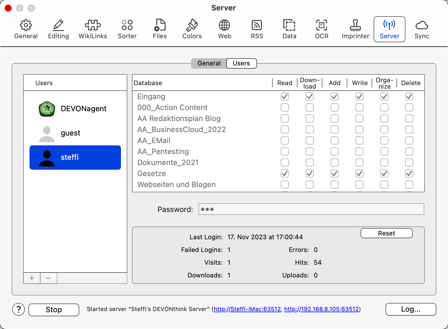 You can add as many users as you like, give them the right to do something with your database, set a secure password. Please note, that the databases have to be opened up in DevonThink bevor adjusting the settings.