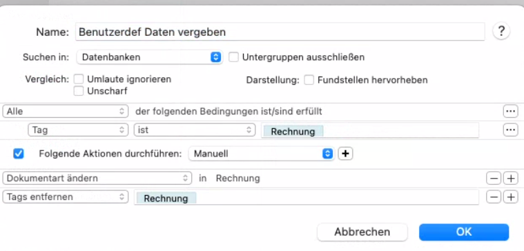 Erstelle eine intelligente Regel, welche die Tags in benutzerdefinierte Daten umwandelt, sodass das Dokumente am Ende nur einen Tag und benutzerdefinierte Daten hat.