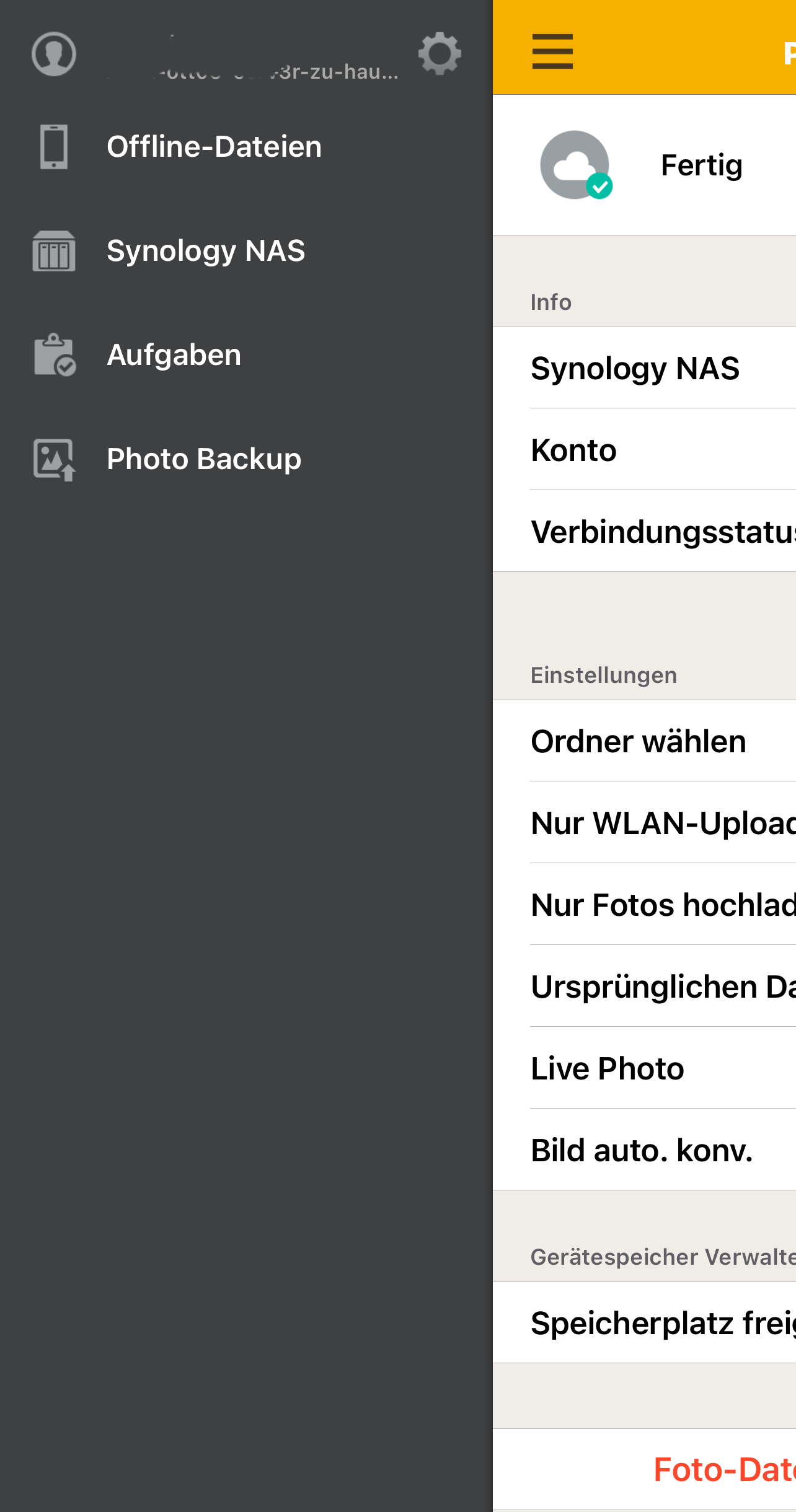In der DS File App wischst Du nach rechts. Dort findest Du die Einstellungen für das Foto Backup.
