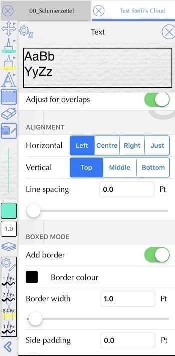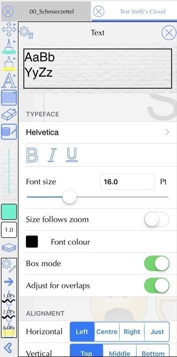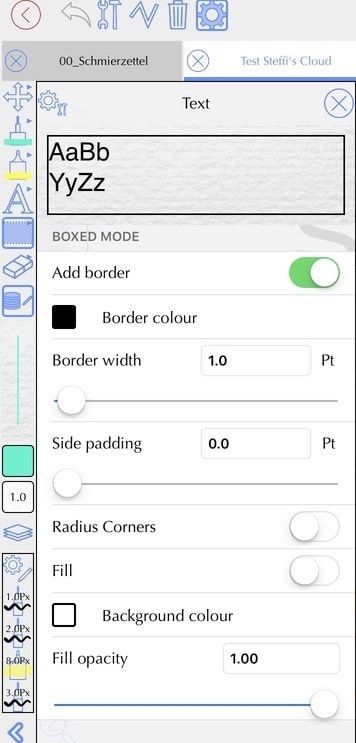 Wähle Deinen Text und geht auf das Zahnrad - Symbol und aktiviere „Box Mode“. Sofort erscheinen so viele Möglichkeiten, wie Du Deinen Text noch weiter „verfeinern“ kannst.