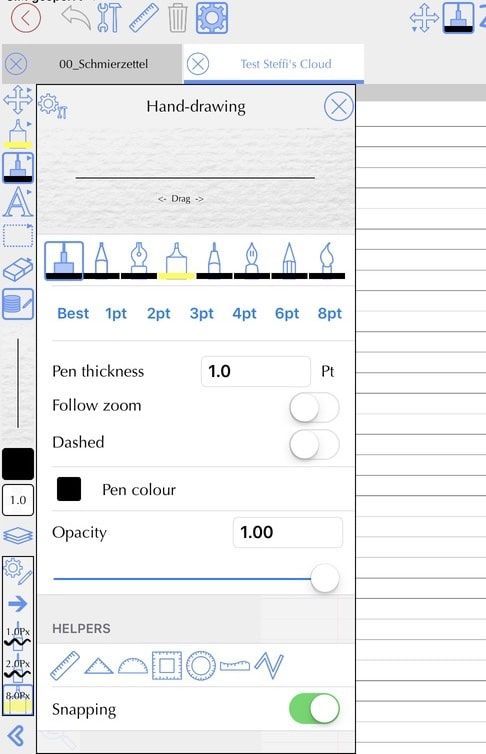 Mit dem „Snapping“ Schalter kannst Du wählen, ob Deine Zeichen an das Blatt so angepasst werden sollen.