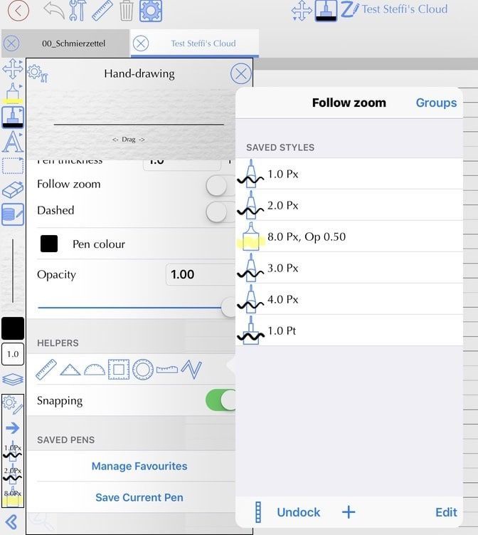 Möchtest Du Deinen Lieblingsstift immer zur Hand haben, kannst Du dies mit „Save Current Pen“ machen und er wird Dir unten immer zur Verfügung stehen.