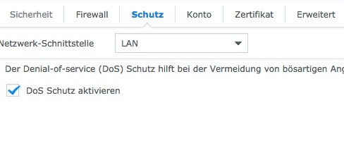 Im gleichen Fenster auf „Schutz“ gehen und die Netzwerkschnittstelle „LAN“ und DoS Schutz aktivieren.