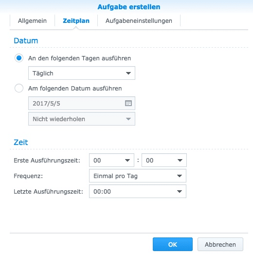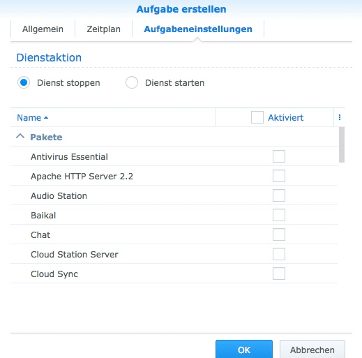 Mit Papierkörben kannst Du zum Beispiel alle Papierkörbe auf Deiner DS nach einem Zeitplan löschen. Dienste, dass sind Deine Programme auf Deiner DS können gestartet und gestoppt werden oder Deine DS kann zu einem bestimmten Zeitpunkt automatisch herunter- oder hochgefahren werden.