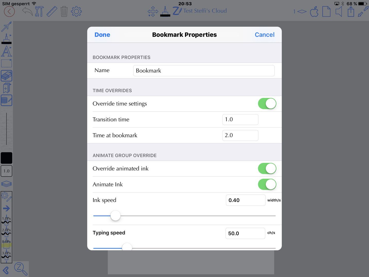 Objekte (also alles) können gruppiert werden und per Lesezeichen angesteuert werden. Gleichermaßen ist es möglich die Schrift zu animieren, sowie deren Geschwindigkeit zu regeln.Auch Texteingaben können animiert werden sowie deren Geschwindigkeit angegeben werden.Show Pen - heißt hier das ein Bild animiert wird und die Stifteingabe animiert wird. Dies sieht dann so aus, als würde der Stift alle Eingaben machen. Auch die Bewegungen der Stifteingabe können verschiedenste Geschwindigkeiten haben.