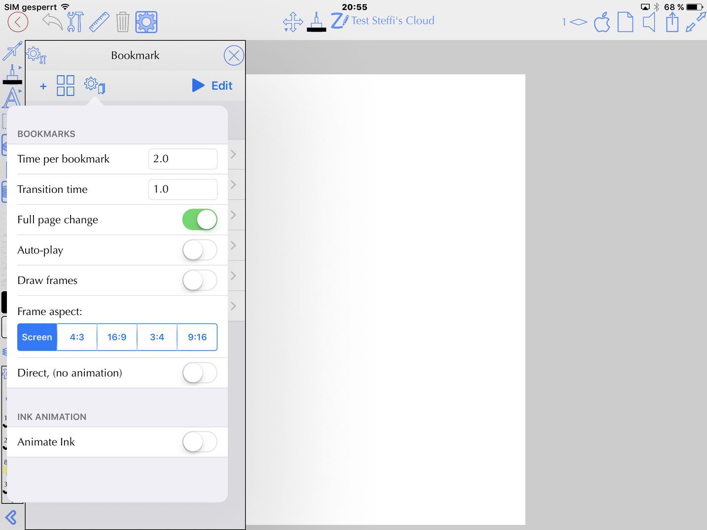 Beabsichtigst Du ein Video mit ZoomNotes aufzunehmen, so kannst Du hier die Grundeinstellungen auf „AN“ stellen. Damit ersparst Du Dir später Zeit für die Sequenzen für Dein Video. - Draw frames