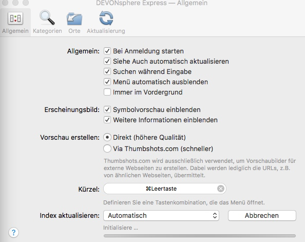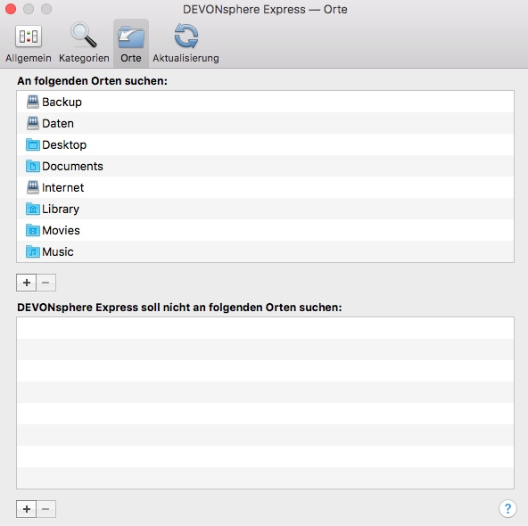 Orte sind die Laufwerke auf Deinem MAC oder Deiner eigenen Cloud wo DEVONsphere Express indizieren „darf“ und Du Deine Informationen finden möchtest.